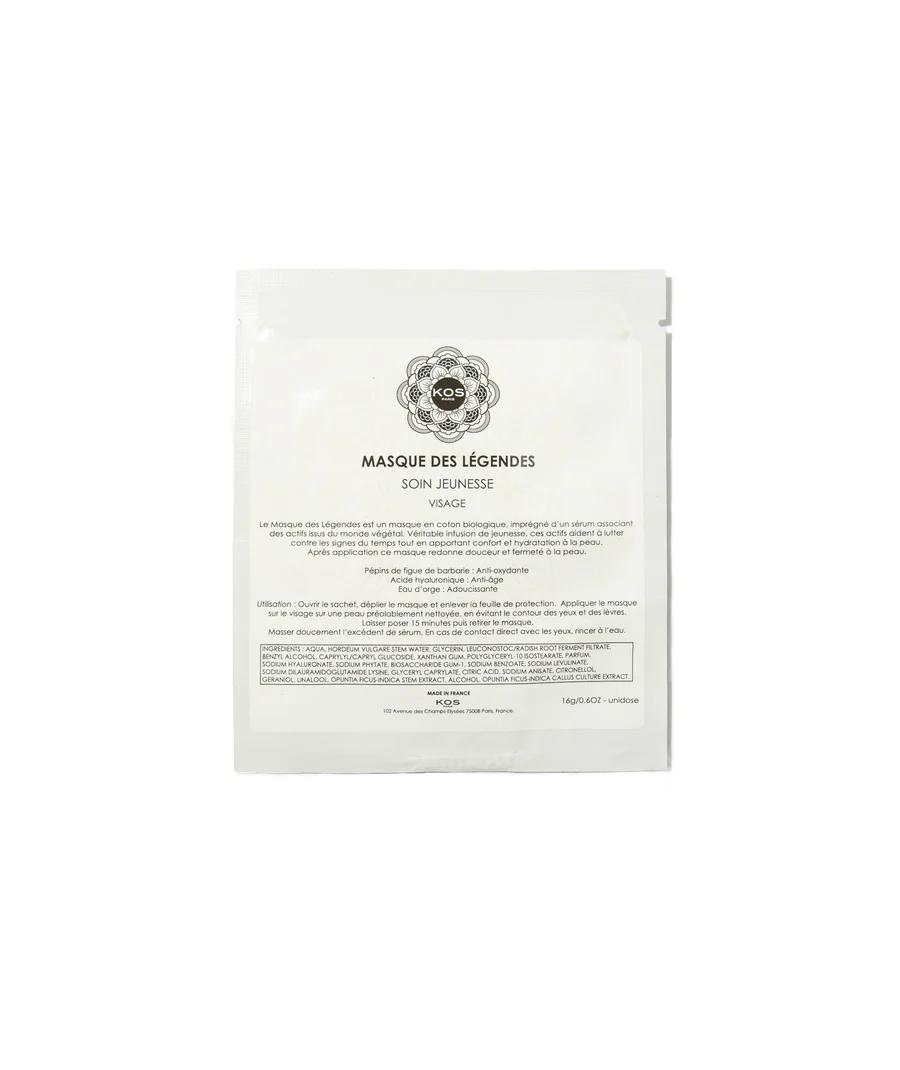 Le Masque des Légendes est un masque en coton biologique imprégné d'un sérum associant des actifs issus du monde végétal. Véritable infusion de jeunesse, ces actifs luttent efficacement contre les signes du temps qui passe, tout en apportant confort et hydratation à la peau.
