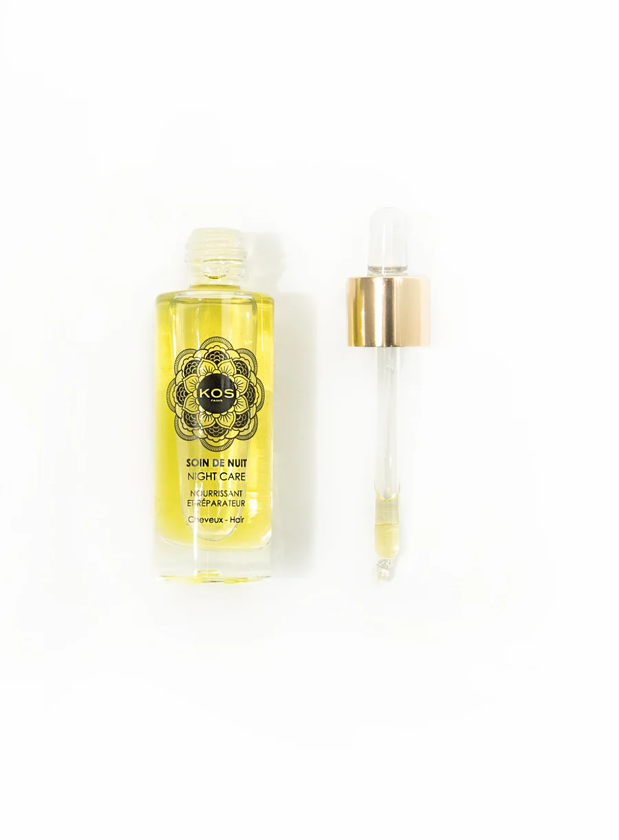 Concentré d'huiles de Coton, Lin et Argan, ce soin de nuit fortifie et redonne brillance et volume à vos cheveux.